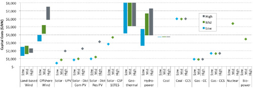 圖1:“2016 Annual Technology Baseline”各類電源的設(shè)備投資額(2015年)(出處: 國家可再生能源實(shí)驗(yàn)室)