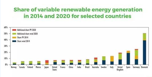 中國儲能網(wǎng)訊:在可再生能源中,風電光伏屬于間歇性的電源。這種間歇性電源的發(fā)電到底能占到總發(fā)電量多大的比例?2014年,丹麥的風電光伏占發(fā)電比例已經(jīng)40%以上,西班牙達到20%,德國10%,其他國家大多低于5%。