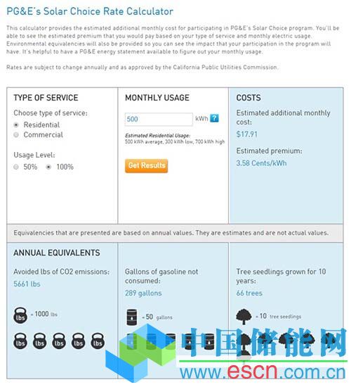 圖2:在PG&E的網站上輸入月均用電量,就可以確認“SolarChoice方案”的追加費用和環(huán)境貢獻數(shù)據(出處:PG&E)