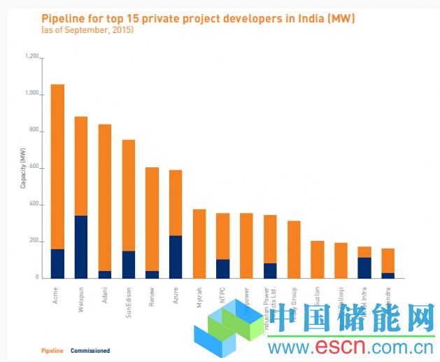 截至2015年9月印度排名前十五位的私營光伏開發(fā)商的項目儲備量。圖片來源:Bridge to India