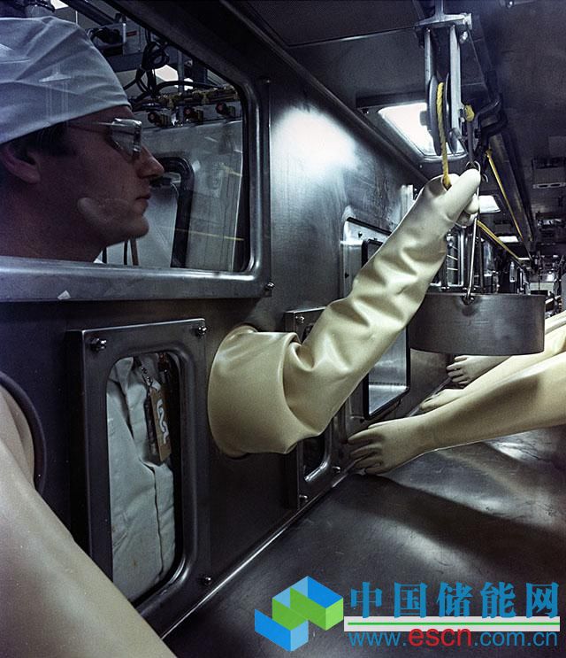 美國(guó)能源部橡樹(shù)嶺國(guó)家實(shí)驗(yàn)室,正戴著手套處理核材料的工作人員