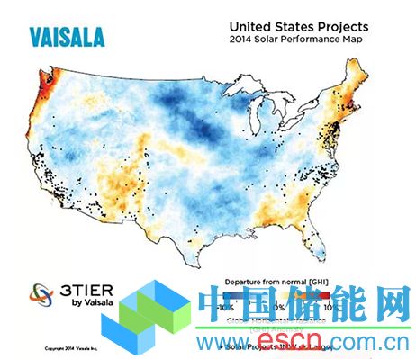 首先是糟糕的天氣。下圖可見,加州南部和內(nèi)華達州2014年的輻照水平與過去15年的平均數(shù)據(jù)相比產(chǎn)生了很大的偏離。Ivanpah項目位于加州南部靠近內(nèi)華達的邊界位置,正好是在地圖中的藍色部分。