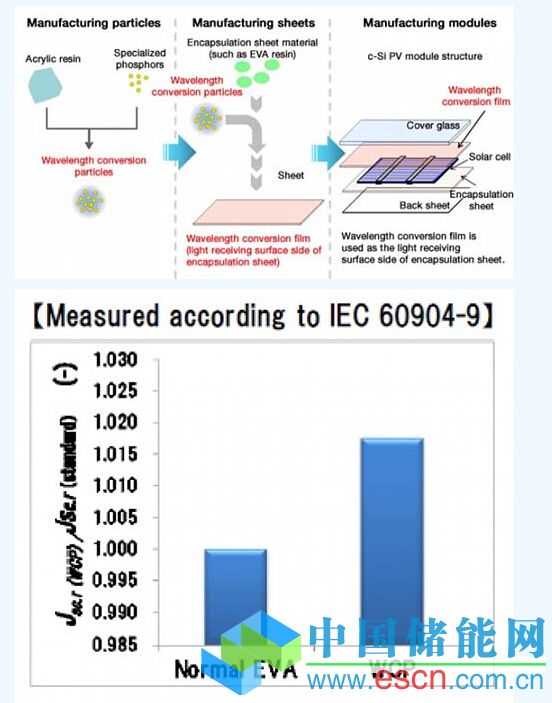 該公司表示,材料制造商將分布在丙稀酸樹(shù)脂粒子內(nèi)的熒光材料與EVA封裝片材混合,獲得短波長(zhǎng)光(紫外線(xiàn)),并且將其轉(zhuǎn)換為長(zhǎng)波長(zhǎng)光(可見(jiàn)光),對(duì)現(xiàn)有薄膜配方的耐久性沒(méi)有影響。