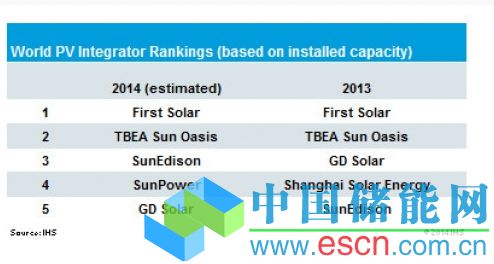 IHS預(yù)計的2014年頂尖EPC公司排名顯示中美公司之間在排名頂端正在進(jìn)行的競爭,最終達(dá)到勢均力敵。