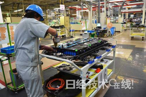 之后將車開(kāi)到名古屋制作所內(nèi)的岡崎工廠中,更換作業(yè)在生產(chǎn)歐藍(lán)德PHEV時(shí)組裝電池的場(chǎng)所進(jìn)行。該場(chǎng)所目前處于未生產(chǎn)的空閑狀態(tài)。用升降臺(tái)將車輛抬起,每輛車輛主要由兩名作業(yè)人員從車輛下方擰開(kāi)螺絲、拆下電池組。
