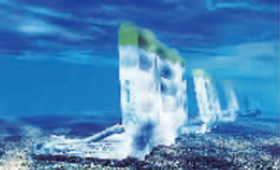 如圖所示,蘇格蘭當前項目準備的更新一代Oyster波浪發(fā)電機目前正在研發(fā)中。每只“牡蠣”,也就是技術(shù)層面上所知的振蕩浪涌轉(zhuǎn)換器(OWSC),安裝在海底的一個巨大杠桿,在海浪中來回搖擺。它在海水深達30至50英尺的岸邊運轉(zhuǎn)。高效率的機器可以成群安放,在極端天氣下也能工作。
