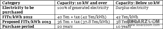 據(jù)日本經(jīng)濟(jì)產(chǎn)業(yè)省透露,自2012年7月至12月期間,約有4GW的光伏項(xiàng)目已經(jīng)獲得FIT項(xiàng)目的審批,這些光伏項(xiàng)目可獲得每千瓦時(shí)42日元的補(bǔ)貼。而最新的補(bǔ)貼費(fèi)率提案請見下表: