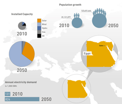 到2020年,可再生能源發(fā)電量將占埃及發(fā)電總量的20%。(如上圖)為了滿足該國快速增長的電力需求量,風(fēng)電或許將扮演一個(gè)重要的角色。Dii 財(cái)團(tuán)預(yù)計(jì),到2050年,可再生能源發(fā)電量將增長6倍,超過800TWh。同期,埃及人口數(shù)量可能將從8000萬人增長至1.20億人。