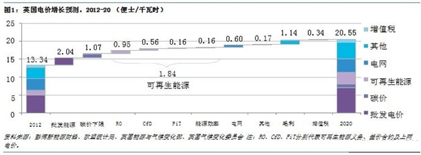 彭博新能源財經(jīng)的分析顯示,從目前到2020年之間英國家庭電費預測增量的40%將歸因于低碳政策(包括從2013年4月起推出的碳價下限以及可再生能源補貼)。