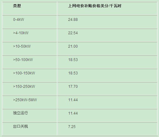自2013年二月一日起將實施的新上網(wǎng)電價補貼價格如下: