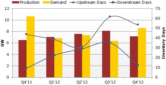 根據(jù)NPDSolarbuzz季度報(bào)告,中國(guó)大陸、臺(tái)灣和其他非歐美日廠商產(chǎn)量的市場(chǎng)份額從2010年第四季度的69%上升到2011年第四季度的78%,并將在2012年第四季繼續(xù)增長(zhǎng)到79%。上游廠商的光伏組件庫(kù)存天數(shù)在2011年第四季度末下降了24%,主要得益于一些廠商在最后一個(gè)季度的產(chǎn)量削減和出貨量拉升。然而下游廠商才是2011年第四季度市場(chǎng)需求爆發(fā)的主要受益人,其組件庫(kù)存天數(shù)較前一季度下降了81%。