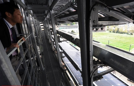 東京工業(yè)大學(xué)日前建成了一座“自給自足”的研究樓,依靠太陽(yáng)能發(fā)電和燃料電池供應(yīng)電力。圖為工作人員觀看建筑表面安裝的太陽(yáng)能發(fā)電板。(攝影 關(guān)賢一郎)