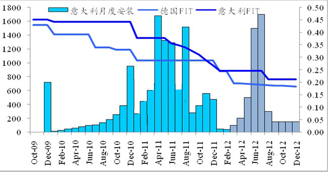 2012年一季度意大利安裝量僅有200MW左右,正常預計全年將有3-4GW的需求量,但由于“第五能源法案”草案中設置了補貼下調(diào)(15%)和補貼上限(每年2-3GW)的條款,預計二季度的搶裝將非常明顯,有望刺激需求達到5GW。