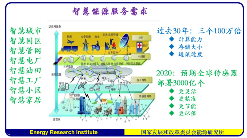 我們看國(guó)際上,過(guò)去30年,三個(gè)100萬(wàn)倍,未來(lái)30年,再提高100萬(wàn)倍,對(duì)我們能源系統(tǒng)是什么樣的沖擊?預(yù)期全球傳感器到2020年將部署3000億個(gè)。
