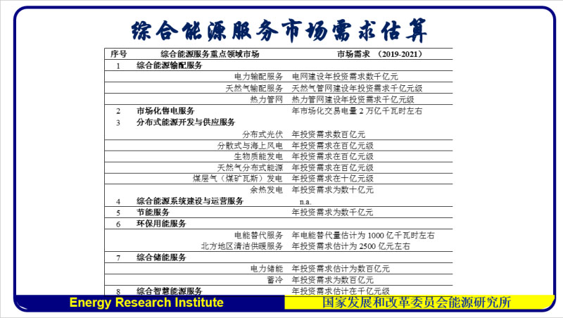今年5月,發(fā)改委發(fā)了《國(guó)家發(fā)改委、科技部關(guān)于構(gòu)建市場(chǎng)導(dǎo)向的綠色技術(shù)創(chuàng)新體系的指導(dǎo)意見(jiàn)》,搞十百千工程,將來(lái)這個(gè)十百千,是綜合能源服務(wù)的提供者。