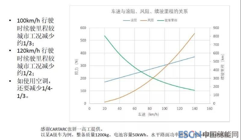 圖中的數(shù)據(jù)不一定非常準確,但可以看到隨著車速增長能耗迅速增加,續(xù)駛里程就迅速下降。簡單的道理就是高速行駛下汽車的能量主要消耗于克服風阻,風阻消耗的功率跟風速的立方成正比。尤其是SUV類車型風阻系數(shù)與迎風面積都比較大。電動汽車以100-120公里/時的車速在高速公路行駛,續(xù)駛里程要較標準工況下減少1/4到1/3,原來400公里的續(xù)駛里程在這種工況下可能就剩下不到300公里,這個現(xiàn)象我認為是正常的,如果要改進就要想辦法降低風阻。