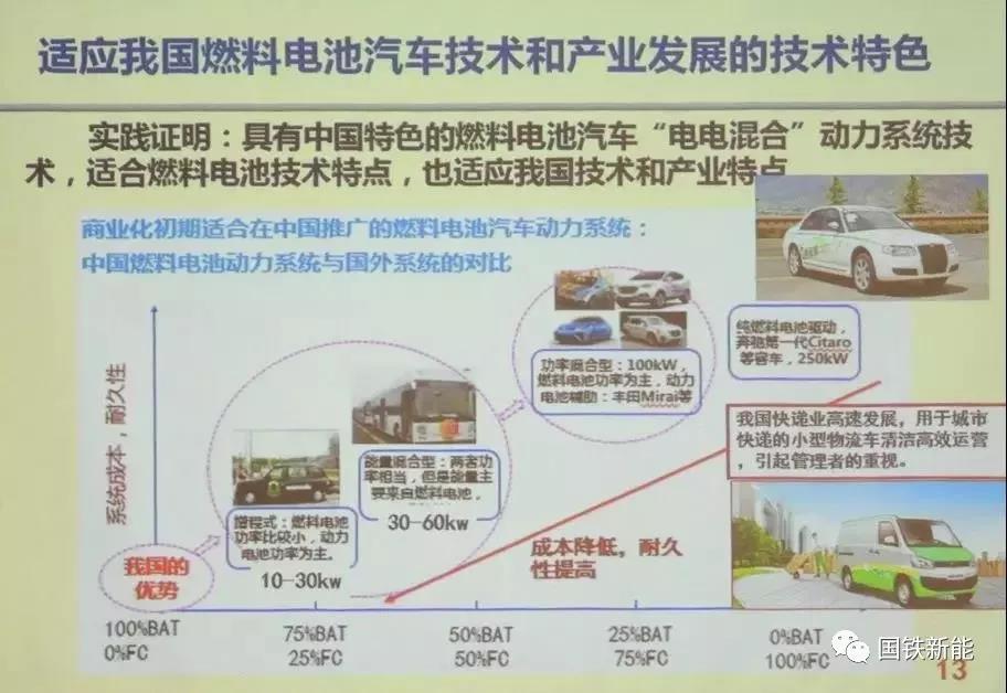 在聯(lián)合國環(huán)境署的支持下,中國進行了三輪燃料電池汽車聯(lián)合示范項目,同時我們還主動倡議和發(fā)起組織了國際氫能燃料電池協(xié)會。目前中國燃料電池汽車取得了明顯進步。在技術(shù)上,中國燃料電池汽車的特色就是電- 電混合動力系統(tǒng),既符合燃料電池本身的技術(shù)特點,也適合中國技術(shù)創(chuàng)新的產(chǎn)業(yè)特點。
