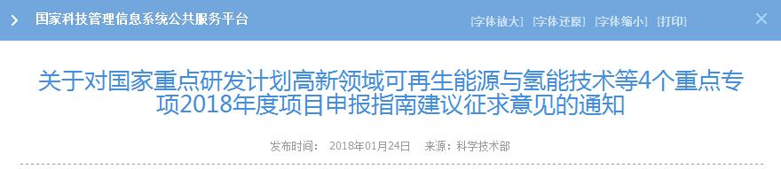 關于對國家重點研發(fā)計劃高新領域可再生能源與氫能技術(shù)等4個重點專項2018年度項目申報指南建議征求意見的通知