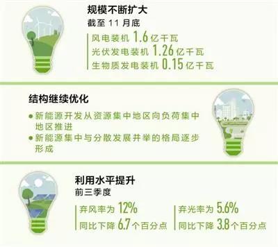 利用水平提升。棄風(fēng)棄光一直是新能源發(fā)展的“老大難”。今年前三季度,棄風(fēng)、棄光率分別為12%和5.6%,同比分別下降了6.7個百分點和3.8個百分點,新疆、甘肅等重點地區(qū)棄風(fēng)率分別下降了12.1個百分點和10.5個百分點。國務(wù)院發(fā)展研究中心資源與環(huán)境政策研究所研究員郭焦鋒認為,新能源技術(shù)也在不斷提升,“我國光伏發(fā)電效率原來大概在14%—16%,現(xiàn)在能達到16%—18%,好一點的甚至能達到20%左右?!?