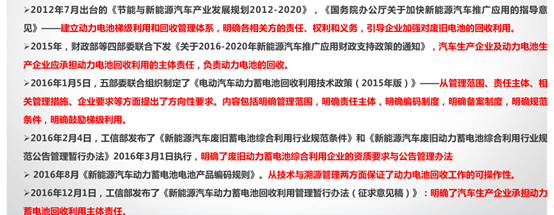 4、政策支持:實(shí)際上從2012年開始國家相關(guān)部門就密集出臺了大量與電池回收相關(guān)的政策、意見。例如:五部委聯(lián)合組織制定了《電動汽車動力蓄電池回收利用技術(shù)政策(2015年版)》、上?;厥找粋€電池包提供一千塊元的補(bǔ)助等。