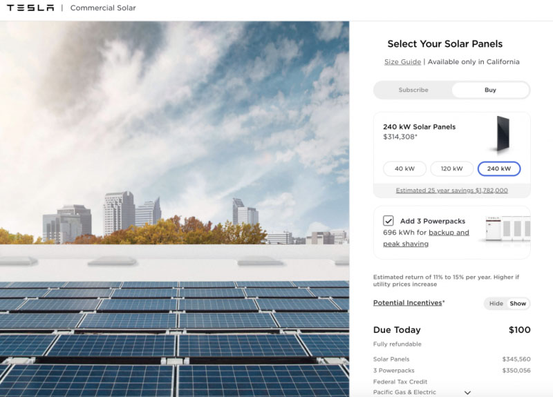在最近的更新中,特斯拉選擇推出與戶用太陽能訂購系統(tǒng)類似的商用太陽能訂購系統(tǒng)。訂購大型太陽能系統(tǒng)的客戶也可以選擇安裝Powerpack,它可以存儲足夠的能量,在晚上高峰期提供電力。這使得訂購商用太陽能系統(tǒng)就像訂購戶用光伏裝置一樣簡單。每單的預定費用為100美元,可全額退還。