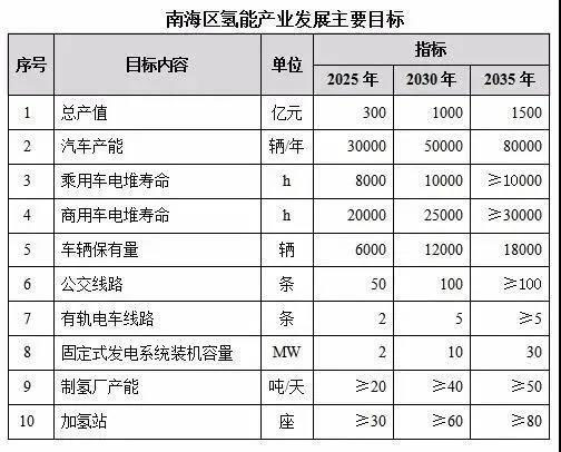 2月24日,南海出臺(tái)《佛山市南海區(qū)氫能產(chǎn)業(yè)發(fā)展規(guī)劃(2020—2035年)》,提出南海區(qū)近期(2020–2025 年)、中期(2026–2030 年)和遠(yuǎn)期(2031–2035 年)三個(gè)階段氫能產(chǎn)業(yè)產(chǎn)值、汽車產(chǎn)能、加氫站建設(shè)目標(biāo)如下: