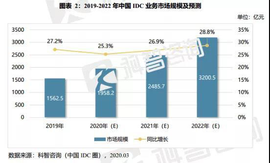 根據(jù)國(guó)內(nèi)知名行業(yè)調(diào)研機(jī)構(gòu)科智咨詢發(fā)布的《2019-2020年中國(guó)IDC產(chǎn)業(yè)發(fā)展研究報(bào)告》顯示,2019年,中國(guó)IDC業(yè)務(wù)市場(chǎng)規(guī)模達(dá)到1562.5億元,同比增長(zhǎng)27.2%。預(yù)計(jì)2019-2022年,中國(guó)IDC業(yè)務(wù)市場(chǎng)規(guī)模復(fù)合增長(zhǎng)率將達(dá)到26.9%。