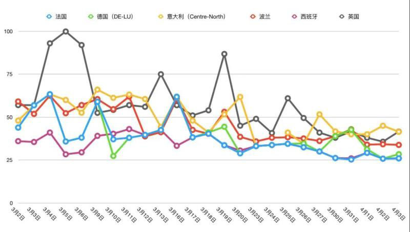 不過安迅思在4月3日發(fā)布的一篇文章中指出,目前德國、法國和意大利的電力消費在經(jīng)過幾周的下降后已經(jīng)趨于平緩,但英國和西班牙的電力消費仍然在下降。如果交易商仍然預計用電需求持續(xù)走低,他們可能需要及時修正預期。并且電力市場的價格波動與電力需求并不完全一致,而是取決于每個國家的電源構成以及機組的邊際成本。