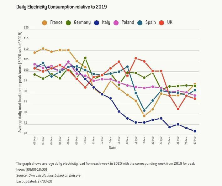 專注于經(jīng)濟學研究的歐洲獨立智庫布魯蓋爾(Bruegel)比較了歐洲六個國家的用電負荷,與2019年相比下降趨勢明顯,如圖1所示。3月23日以后上述六個國家的工作日用電負荷均低于去年同期。