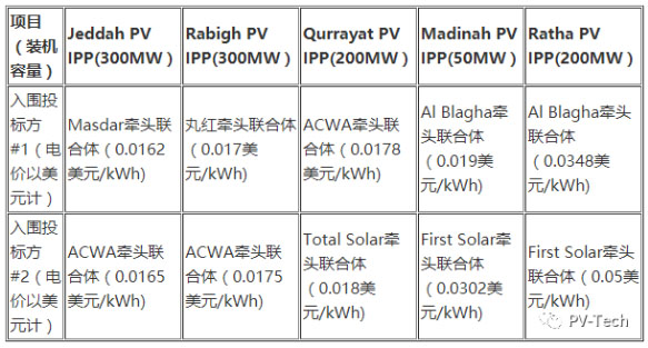 REPDO還說(shuō)明了第二輪招標(biāo)中其他項(xiàng)目的電價(jià)。從ACWA到First Solar、丸紅等公司,入圍投標(biāo)方(見(jiàn)下表)為20MW-300MW光伏項(xiàng)目報(bào)出了多種價(jià)格。