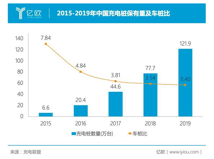 截至2015年底,我國(guó)公共類(lèi)充電設(shè)施保有量?jī)H5.7萬(wàn)臺(tái)。這一數(shù)字在2019年底已達(dá)到121.9萬(wàn)臺(tái),增長(zhǎng)了21倍。在充電樁高速建設(shè)的同時(shí),全國(guó)車(chē)樁比水平也在持續(xù)優(yōu)化,已由2015年的7.8:1提升至2019年底的3.4:1。