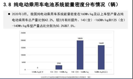 純電動乘用車系統(tǒng)能量密度在160Wh/Kg以上車型產(chǎn)量占純電動乘用車總產(chǎn)量42.2%;較2月有所提升。140(含)-160Wh/Kg和125(含)-140Wh/Kg車型產(chǎn)量占比分別為50.3%和7.5%。