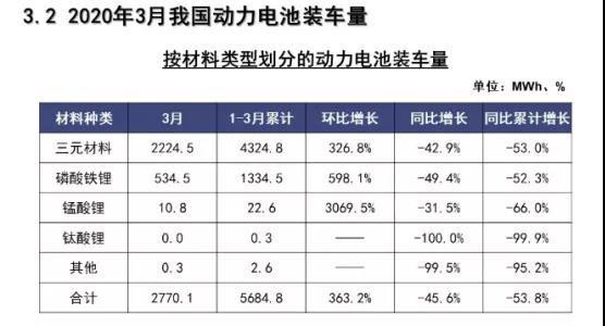 2020年1-3月,我國動力電池裝車量累計5.7GWh,同比累計下降53.8%。其中三元電池裝車量累計4.3GWh,占總裝車量76.1%,同比累計下降53.0%;磷酸鐵鋰電池裝車量累計1.3GWh,占總裝車量23.5%,同比累計下降52.3%。