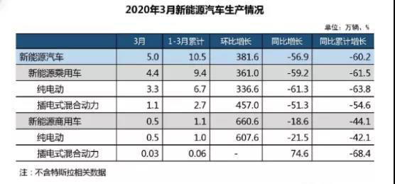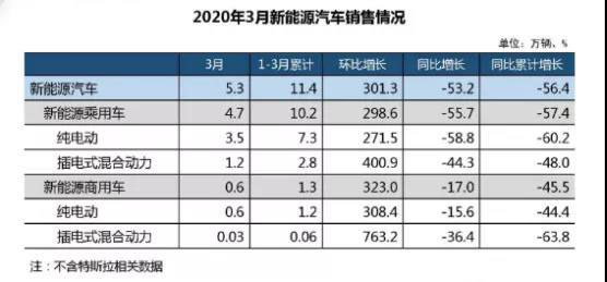 3月10日,中國汽車工業(yè)協(xié)會發(fā)布最新產(chǎn)銷數(shù)據(jù)顯示,3月,新能源汽車產(chǎn)銷(不含特斯拉)分別完成5.0萬輛和5.3萬輛,環(huán)比增長3.8倍和3.0倍,同比下降56.9%和53.3%。在新能源汽車主要品種中,純電動汽車和插電式混合動力汽車產(chǎn)銷環(huán)比均呈大幅增長,同比依然呈較快下降。
