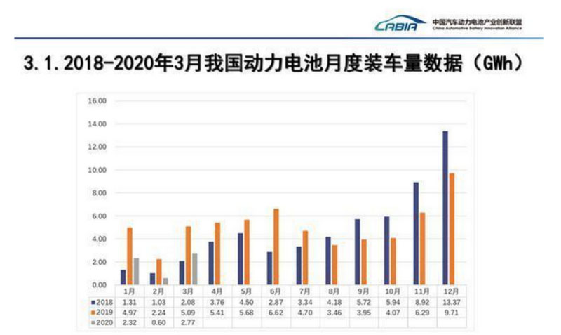 4月10日消息,3月,我國動力電池產(chǎn)量共計4.5GWh,同比下降45.5%,環(huán)比增長396.6%;銷量共計3.0GWh,同比下降55.7%。1月-3月,動力電池產(chǎn)量累計8.3GWh,同比累計下降58.3%;累計銷量達7.9GWh,同比累計下降54.9%。裝車量方面,3月,動力電池裝車量約2.8GWh,同比下降45.6%,環(huán)比上升363.2%,產(chǎn)業(yè)呈現(xiàn)逐漸恢復的趨勢。