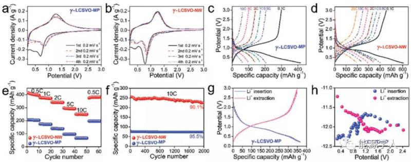 在本文中,復旦大學車仁超教授聯(lián)合青島大學林春富教授等課題組通過一種Cr3+–Si4+共摻雜Li3VO4(LVO)的策略,成功設計出一種具有穩(wěn)定、高能、快充、安全的新型負極材料γ相 Li3.08Cr0.02Si0.09V0.9O4(γ‐LCSVO)用于鋰離子電池。具有自由3d電子的Cr3+加入能夠有效地提高電子電導率和倍率性能,因此作者制備出兩種不同形貌的γ-LCSVO材料。通過靜電紡絲策略和固相反應法可分別制備出γ-LCSVO納米線(γ‐LCSVO‐NW)和γ-LCSVO微米級顆粒(γ‐LCSVO‐MP),兩種材料均具有優(yōu)異的綜合電化學性能,可滿足高性能LIBs的關鍵要求。利用原位X射線衍射(XRD)、原位透射電子顯微鏡(TEM)、幾何相分析(GPA)、密度泛函理論(DFT)計算和球差校正掃描電子顯微鏡(STEM),作者對γ-LCSVO的Li+存儲機理進行了深入研究。結(jié)果表明,Li+依次插入γ-LCSVO的4c(1)和8d位點,但其最大體積變化和平均應變分別僅為0.18%和0.07%。因此,γ-LCSVO具有典型的“零應變”特性,并具有杰出的循環(huán)穩(wěn)定性,在10C下進行2000次循環(huán)后,γ-LCSVO-NW和γ-LCSVO-MP的容量保持率分別為90.1%和95.5%。