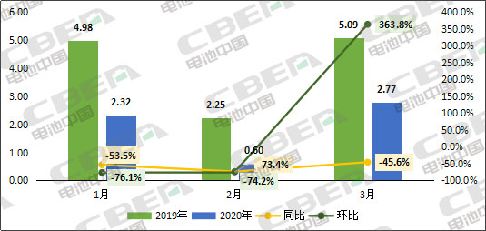 動(dòng)力電池應(yīng)用分會(huì)研究部統(tǒng)計(jì)的整車合格證數(shù)據(jù)顯示,2020年一季度國(guó)內(nèi)新能源汽車產(chǎn)量達(dá)11.23萬輛,同比下降57.2%;搭載的動(dòng)力電池裝機(jī)量約5.68GWh,同比下降53.8%。其中,3月份新能源汽車產(chǎn)量5.18萬輛,同比下降51.8%,環(huán)比增長(zhǎng)335.0%;搭載的動(dòng)力電池裝機(jī)量約2.77GWh,同比下降45.6%,環(huán)比增長(zhǎng)363.8%。