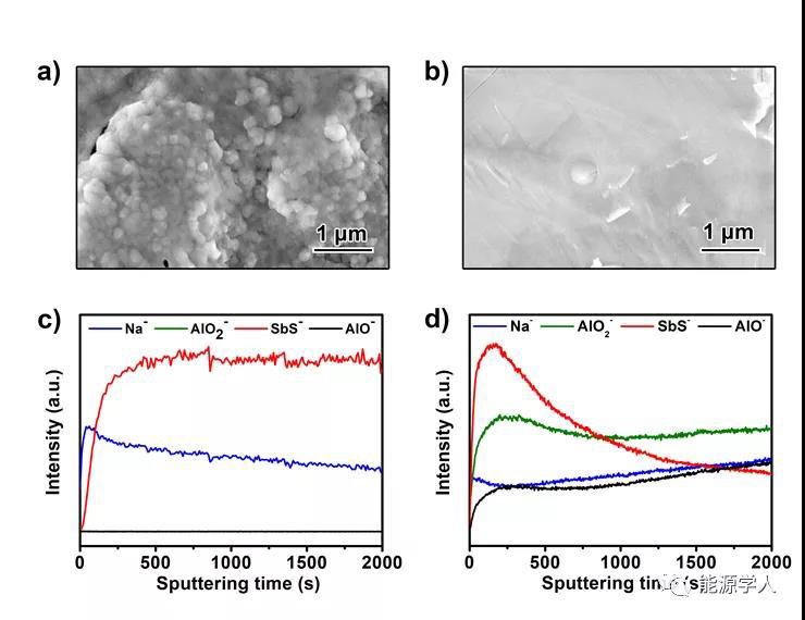 圖3 經(jīng)過電化學(xué)循環(huán)后鈉金屬表面形貌和組分表征:a)和c)為無alucone保護(hù)的鈉金屬;b)和d)為alucone保護(hù)過的鈉金屬。