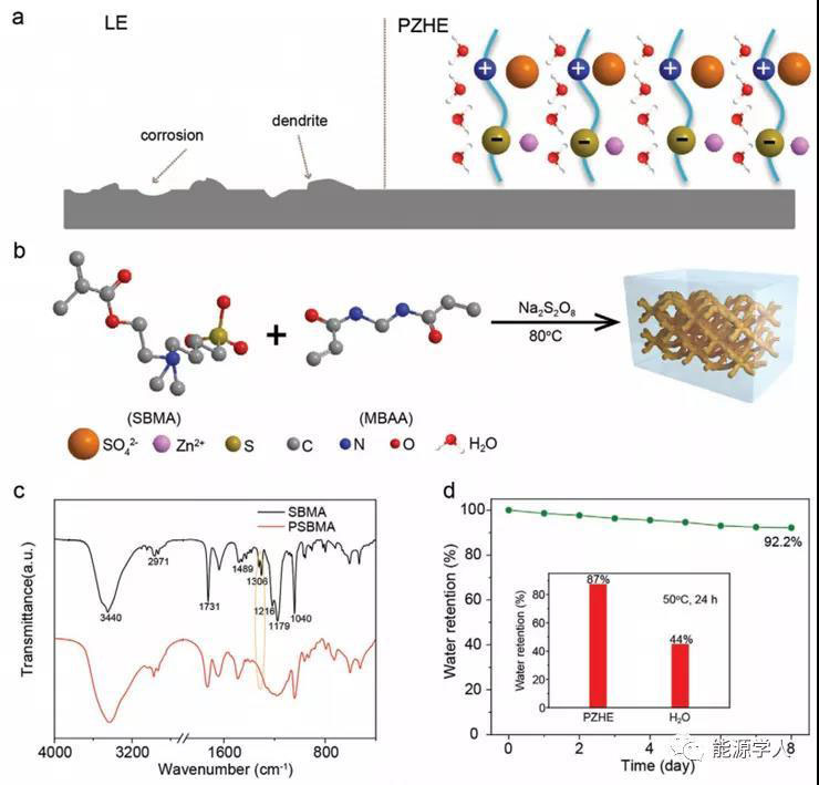 盡管水系鋅金屬電池具有安全、經(jīng)濟、環(huán)保等優(yōu)點,但鋅金屬在水系環(huán)境中枝晶的生長和不可避免的腐蝕問題嚴重制約了其進一步的發(fā)展。在本文中,為了實現(xiàn)鋅的長期可逆沉積/溶解性,天津大學羅加嚴教授課題組構(gòu)建出一種室溫離子電導(dǎo)率為32.0 mS cm?1且Zn2+遷移率為0.656的聚兩性離子水凝膠電解質(zhì)(PZHE),其中兩性離子聚合物中豐富的親水基團和帶電基團能很好地固定聚合物骨架中的水分子,從而減少電池副反應(yīng)的發(fā)生。此外,兩性離子聚合物中的帶電基團可以使離子分布均勻,實現(xiàn)均勻的鋅沉積。因此,含有PZHE的對稱電池可穩(wěn)定運行3500 h以上,以VS2和MnO2為正極的全電池也表現(xiàn)出優(yōu)異的循環(huán)穩(wěn)定性。由于將物理和化學交聯(lián)凝膠的優(yōu)點進行結(jié)合,因此所合成出的PZHE使柔性準固態(tài)鋅金屬電池具有優(yōu)異的可加工性、自愈性和安全性,即使在切割、浸泡、錘擊、清洗、燃燒和冷凍等各種極端條件下也能穩(wěn)定工作。
