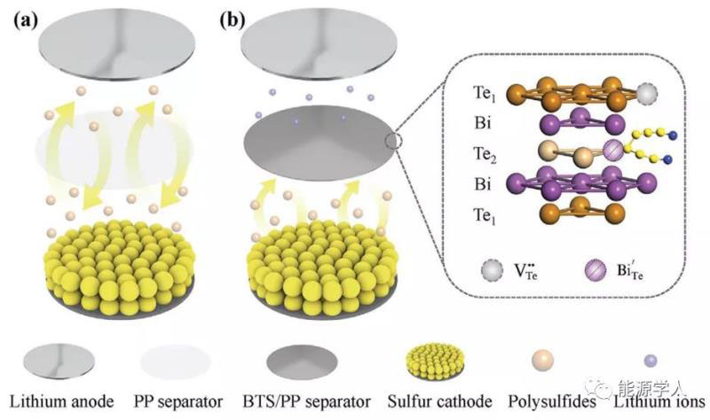在本文中,華中科技大學黃云輝教授、李真教授課題組成功將Bi2Te2.7Se0.3 (BTS)引入隔膜表面形成本征反位缺陷,并系統(tǒng)研究了這些缺陷對鋰硫電池性能的影響。BTS是一種具有高密度反位缺陷的典型化合物,其具有來源豐富,價格低廉,對環(huán)境無害等優(yōu)點。在BTS中,反位缺陷Bi′Te與Te空位V′Te共存,而前者是主要的本征缺陷。作者通過磁控濺射法在聚丙烯(PP)隔膜(簡稱為BTS/PP)上設(shè)計出納米級BTS界面層,該超薄納米BTS界面層的面積質(zhì)量密度位0.03 mg cm?2,成功避免了整個電池系統(tǒng)能量密度的損失。因此,所設(shè)計出的電極具有很高的載硫量和優(yōu)異的電化學性能。此外,采用密度泛函理論(DFT)計算,作者探討了多硫化鋰物種與BTS反位缺陷之間的相互作用,表明多硫化物在充放電過程中會被本征的反位缺陷有效地阻擋。