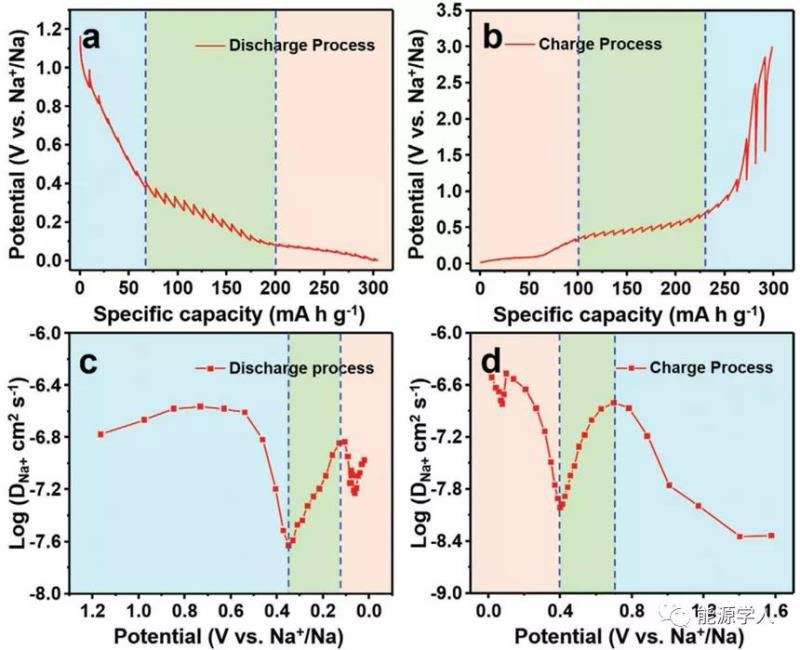 盡管已有研究表明超微孔(<0.7nm )可以通過減少碳表面與電解液的接觸,為Na+的提供傳輸通道,并減緩固態(tài)電解質(zhì)界面(SEI)膜的形成;然而,在首次放電過程中,還是會有大量較大的微孔(>0.7nm)促進SEI薄膜的形成。因此,制備具有均勻超微孔的硬碳負極是非常理想的,但是一個非常具有難度的工作。在本文中,大連理工大學陸安慧教授課題組成功合成出具有均勻超微孔(≈0.5 nm)結(jié)構(gòu)和含C=O/O-H官能團的硬碳納米片負極材料,其表現(xiàn)出高容量(在0.02 A g?1電流密度下的容量為318 mA h g?1),高倍率性能(在5.00 A g?1電流密度下的容量為145mA h g?1),和高達71.2%的首次庫倫效率。當電位低于1.00 V時,約95%的比容量可供實際使用。此外,作者還提出了一種新的雙平臺充電模型。