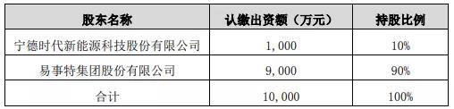 其中易事特以自有資金認(rèn)繳出資9000萬元,占90%股權(quán);寧德時(shí)代認(rèn)繳出資1000萬元,占10%股權(quán)。