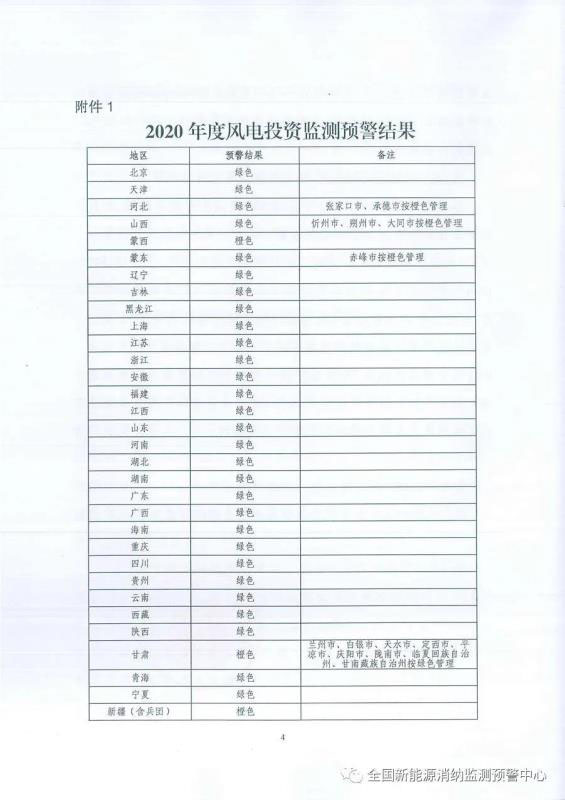 2020年4月3日,國家能源局發(fā)布《2020年度風(fēng)電投資監(jiān)測預(yù)警結(jié)果》和《2019年度光伏發(fā)電市場環(huán)境監(jiān)測評價(jià)結(jié)果》(國能發(fā)新能〔2020〕24號)。結(jié)合全國新能源消納預(yù)警中心開展的年度預(yù)警研究工作,本文重點(diǎn)對風(fēng)電投資監(jiān)測預(yù)警結(jié)果進(jìn)行解讀。