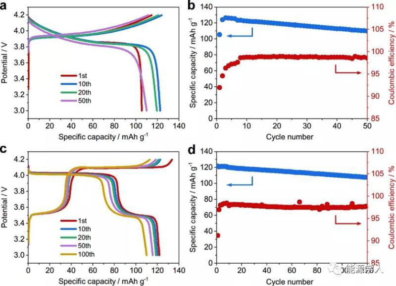 圖5 使用不同正極材料時PEO全固態(tài)電池的充放電曲線與循環(huán)性能。(a,b) LATP包覆LiCoO2;(c,d)LiMn0.7Fe0.3PO4。