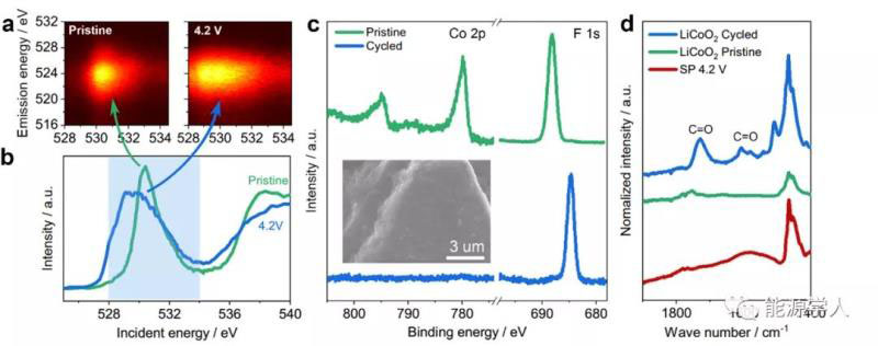 圖3 原始鈷酸鋰和4.2V充電態(tài)鈷酸鋰的(a)RIXS和(b)XAS表征;(c)循環(huán)前后電極表面的XPS(插圖為失效后電極表面形貌)和(d)紅外光譜對比。其中SP電極為4.2V恒壓48小時后的表征結(jié)果。