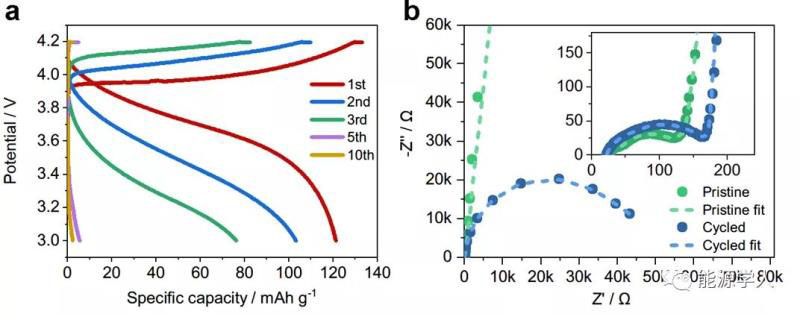 圖2 LCO|PEO-LiTFSI|Li電池(a)循環(huán)不同周次時的充放電曲線和(b)循環(huán)前后的阻抗測試及擬合結(jié)果。