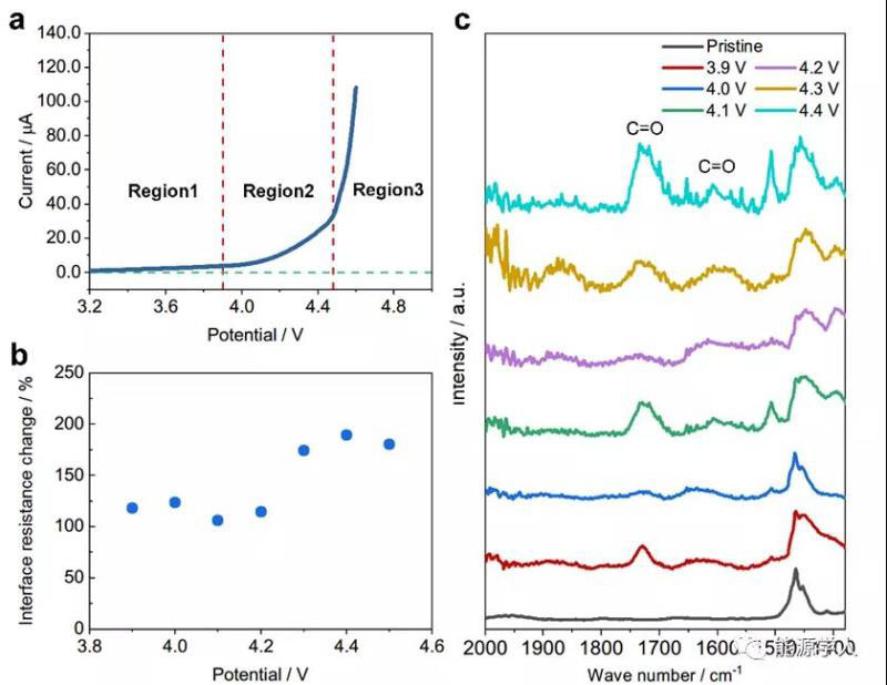 圖1 基于碳惰性電極SP|PEO-LiTFSI|Li電池的(a) LSV測試;(b)在不同電位下恒壓48小時后與原始阻抗值的對比;(c)不同電位下氧化產(chǎn)物的紅外光譜表征。