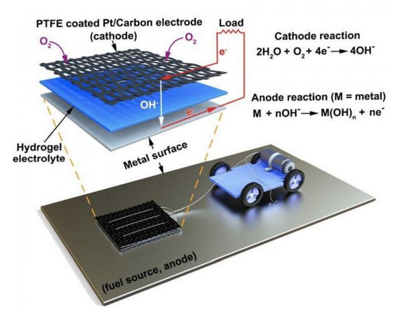 該陰極則由碳組成并伴有聚四氟乙烯(PTFE)涂層及納米級(jí)鉑嵌入其中。電解質(zhì)是一種含有鹽水的水凝膠。當(dāng)這種膠狀的物質(zhì)被拖到金屬表面時(shí)其就會(huì)氧化金屬表面以下的部分、分解化學(xué)鍵為其自身提供能量。與此同時(shí),陰極材料正在減少其上方空氣中的氧氣。