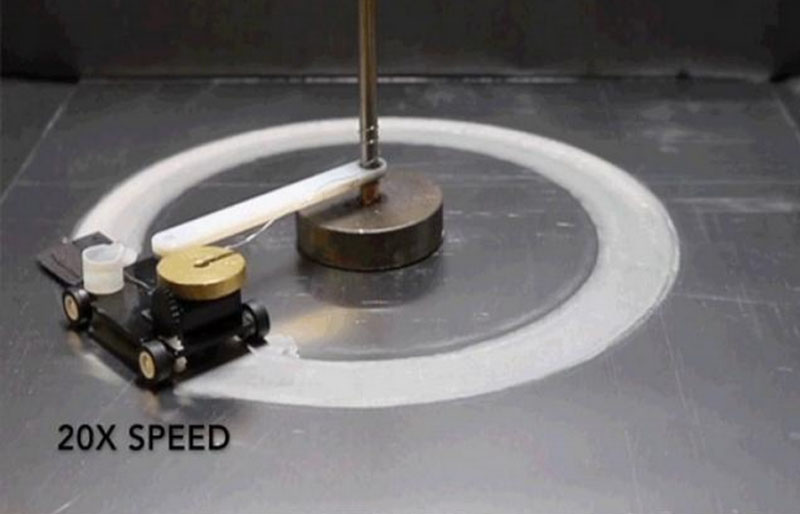 研究人員通過(guò)將MAS系統(tǒng)連接到電動(dòng)汽車(chē)模型上將水凝膠沿著鋁表面拖動(dòng)演示了這項(xiàng)技術(shù)。這輛自我供能的汽車(chē)只需攜帶少量的水來(lái)對(duì)水凝膠定期濕潤(rùn)即可在原地打轉(zhuǎn)。