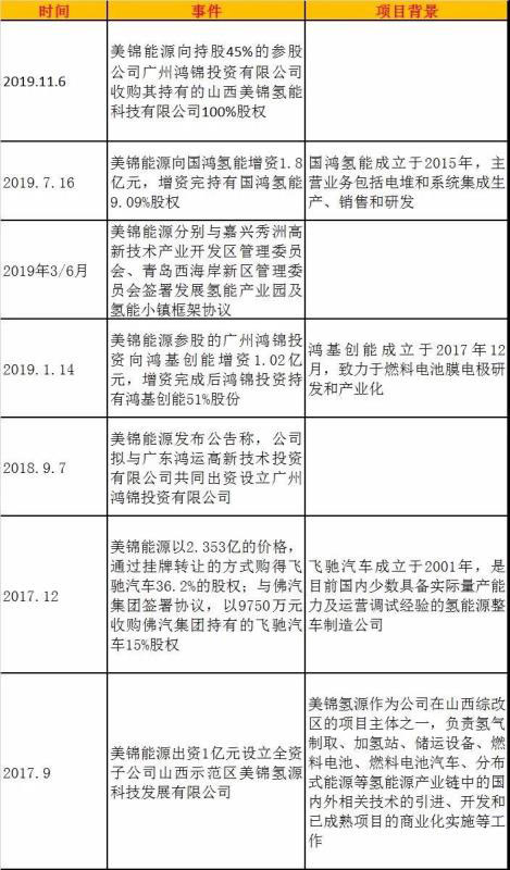 資料顯示,美錦能源主要從事焦炭及其制品、煤炭、天然氣及煤層氣等生產(chǎn)經(jīng)營。公司2017年開始籌劃布局氫能及燃料電池行業(yè),具體進展見下表: